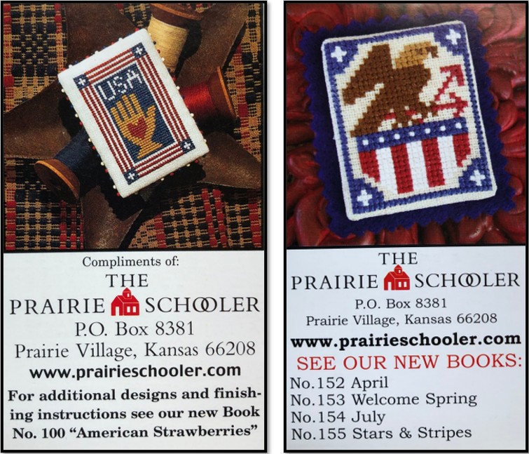 The Prairie Schooler is a company that operated for about 33 years before they closed up shop. Their website is still up for informational purposes only and you can see their entire library of patterns. Though they are no longer taking orders, you can often still find their patterns at various retail shops, or on sites like Ebay and Etsy. Since I am committing to doing 12 projects this year, and my full-time job takes up a good chunk of my time, I am trying to keep them on the smaller side. The Prairie Schooler used to give out free mini-cards which had a small pattern related to the books that they were promoting, some of which were patriotic themed. Here are a couple of them below: