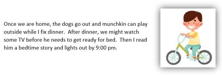 Dinner is over and the dishes are done. Now it’s time for Munchkin’s bedtime routine. He gets to play in the bath for a while, then it’s a bedtime story, usually one about dinosaurs. I tuck him in and turn out the light. This leaves a couple hours of me time. I catch up on a favorite series with a cup of tea and wind down. Then get ready for bed myself. It has been a good day, no, the perfect day!