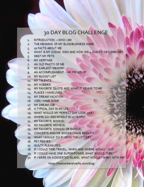 I am new to blogging and thought a 30-Day Blog Challenge would be a good way to build my own blogging habit and also for my readers to get to know a little bit about me. So, this month, I am hosting a 30-Day Blog Challenge. What’s that, you say? It’s a challenge designed to give you a jump-start and get you (and me) blogging each day. I have compiled 30 topics or questions, one for each day. If you are like me, and need a little nudge, then join in! You can jump in anytime.