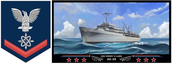 After completing my training at Mare Island, I was assigned to the Emory S. Land (AS-39). This is a sub-tender, which is basically a floating repair ship. I maintained and repaired mainframe computers, magnetic tape units, monitors, printers, and other peripheral equipment. I spent a total of 3 1/2 years in the Navy before getting an Honorable Discharge due to an injury.