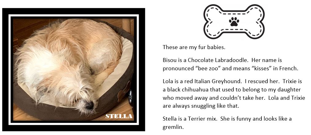 9 – I love animals, but dogs are my favorite. I currently have 4 dogs. I have a chocolate labradoodle named Bisou, which means kiss in French, so she is my chocolate kiss. I know, I’m a dork. I have a white terrier mix named Stella, a red Italian greyhound named Lola, and a little black chihuahua named Trixie.